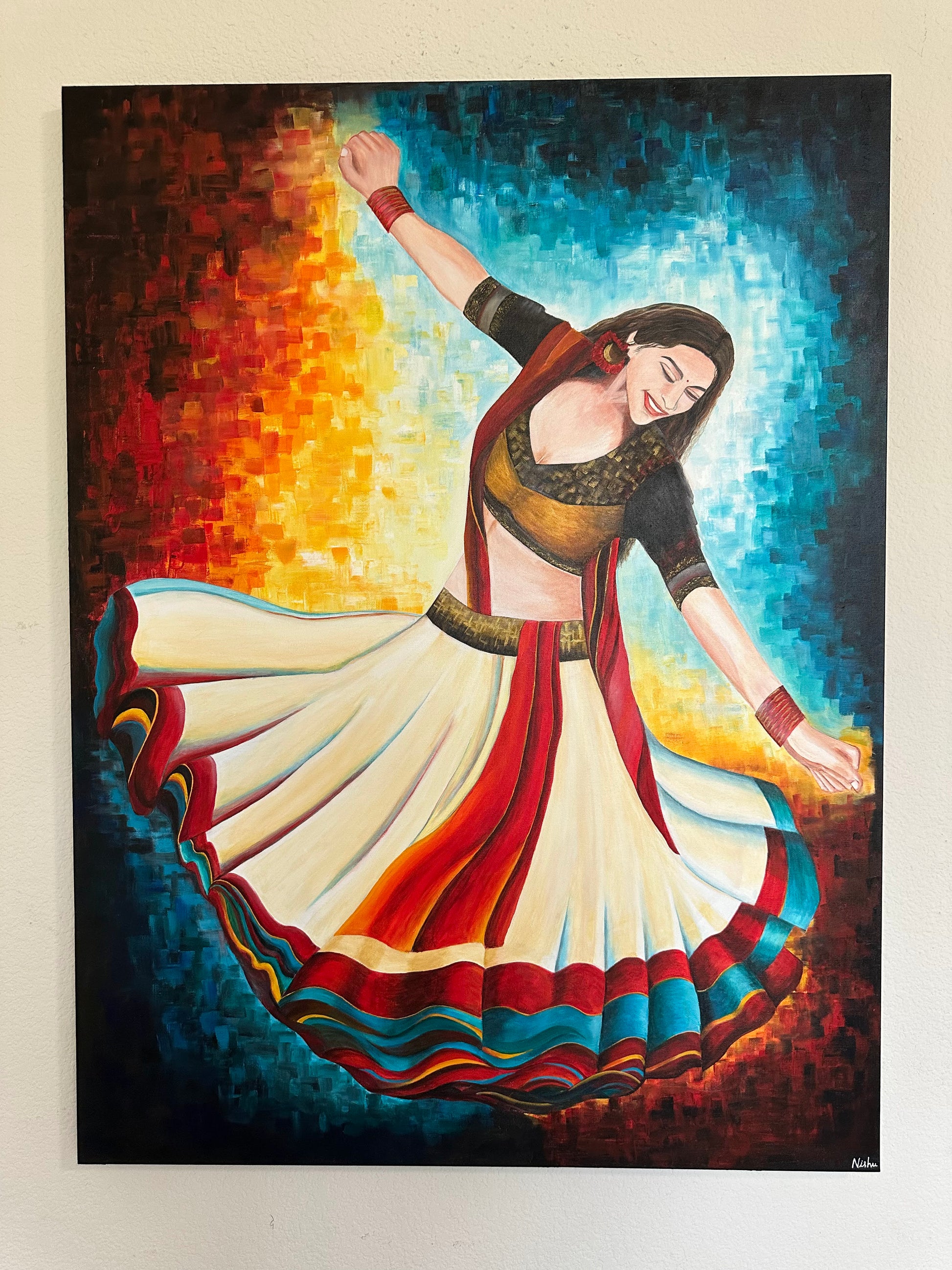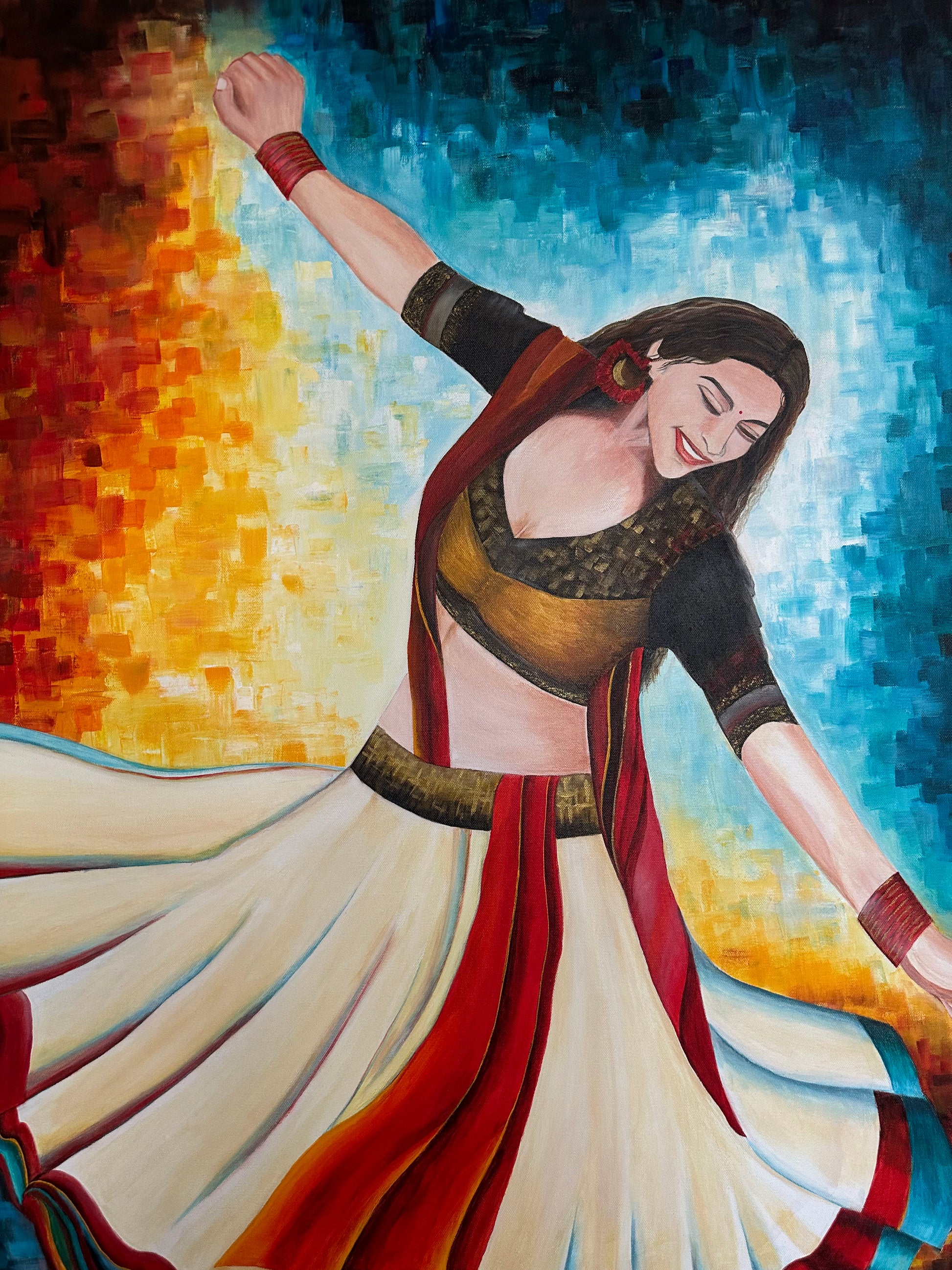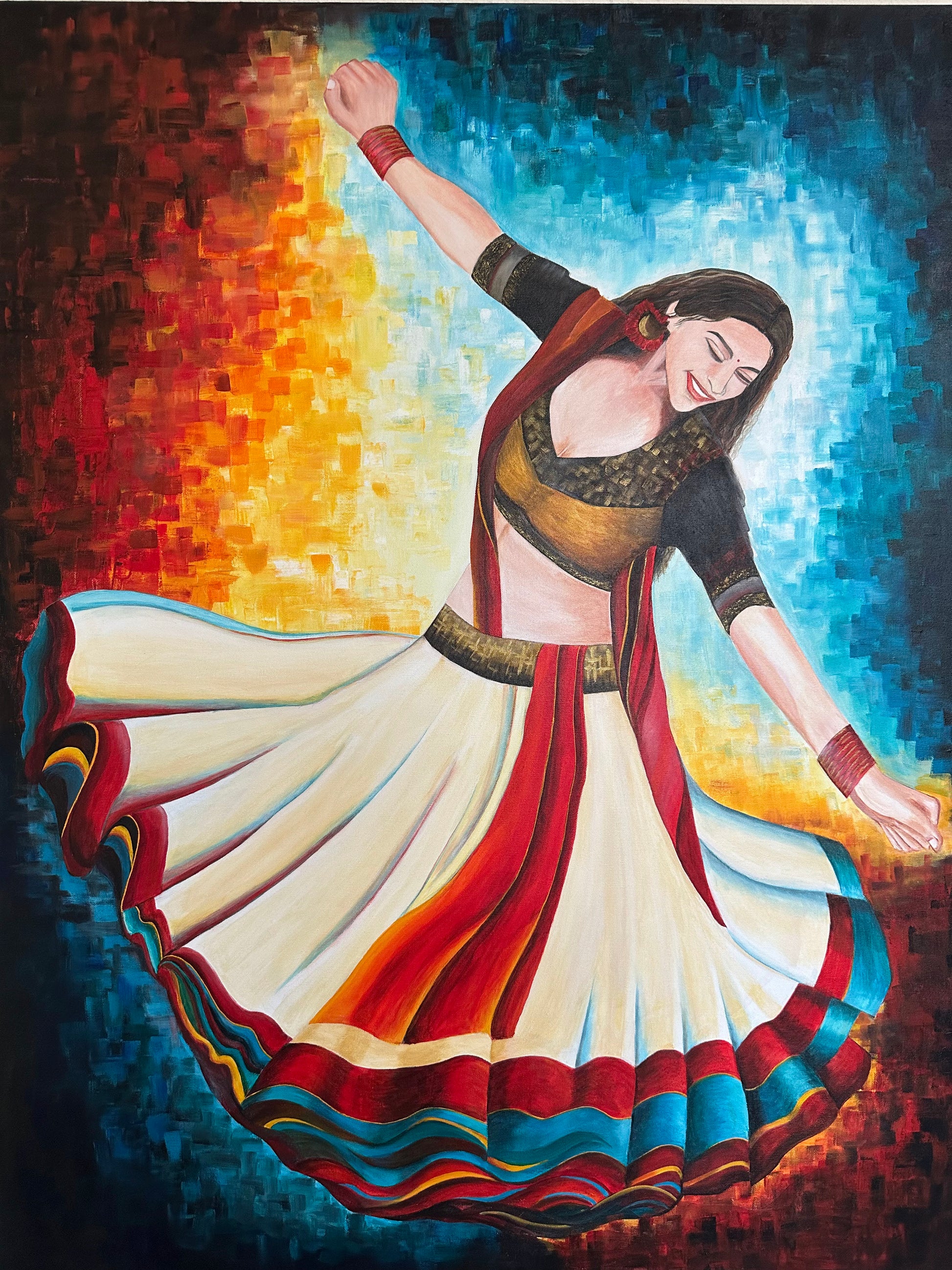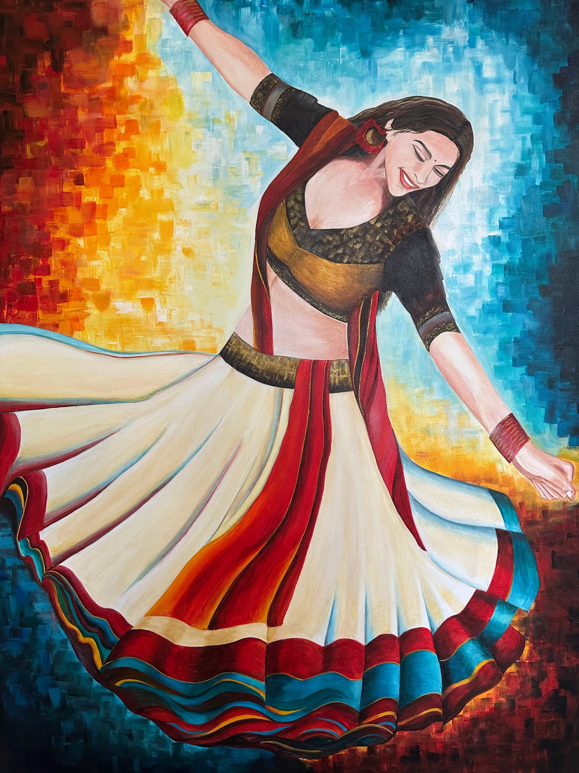 This painting captures the dynamic spirit of Garba dance through a vivid portrayal of a young girl in motion. Dressed in a traditional lehenga choli with striking red, black, and white hues, her swirling attire embodies energy and cultural richness. The pixelated mosaic backdrop of red, yellow, and blue enhances the composition by blending warmth and passion with a modern, balanced contrast. This artwork celebrates the harmony of tradition and contemporary expression with expert finesse.