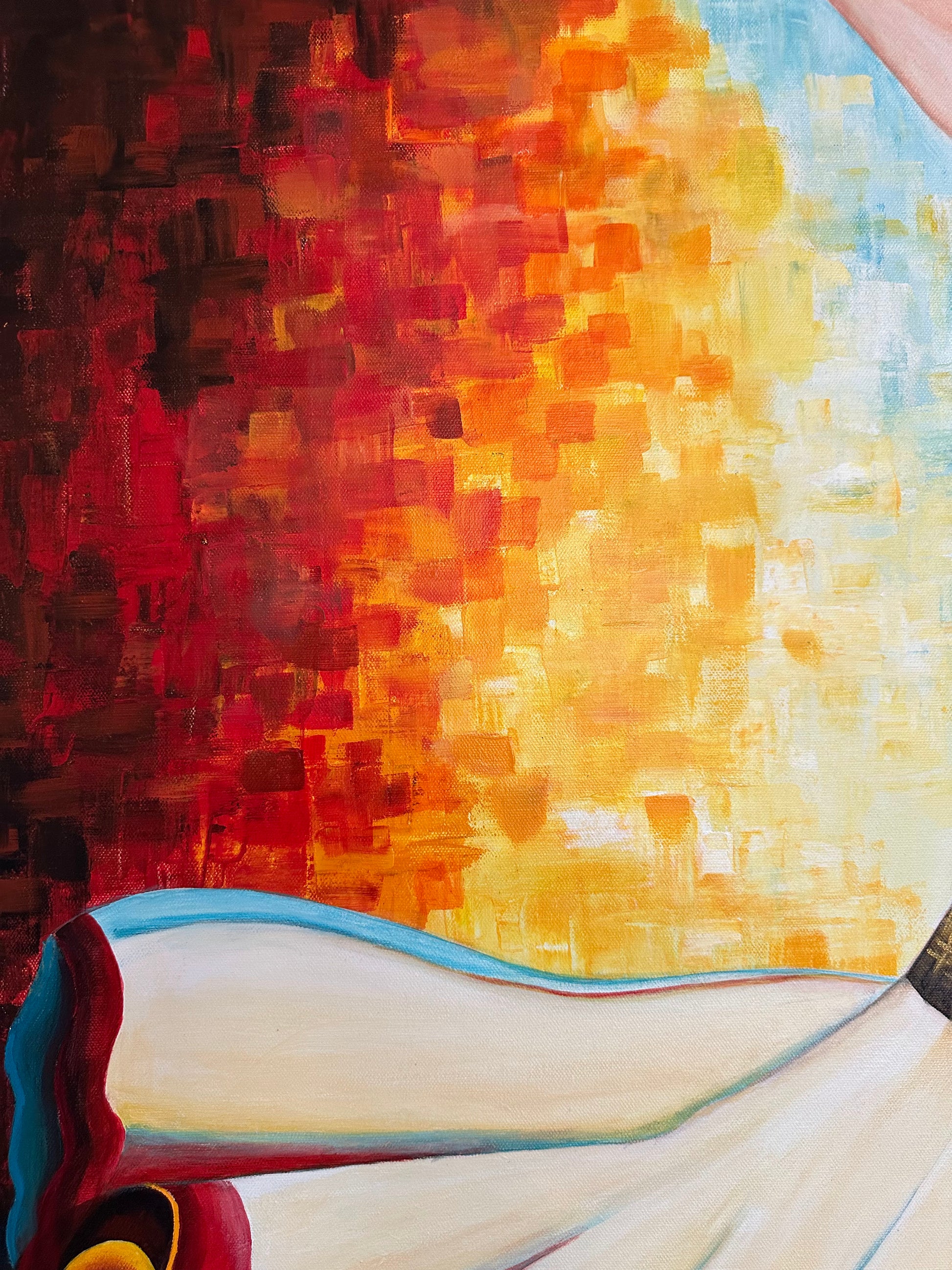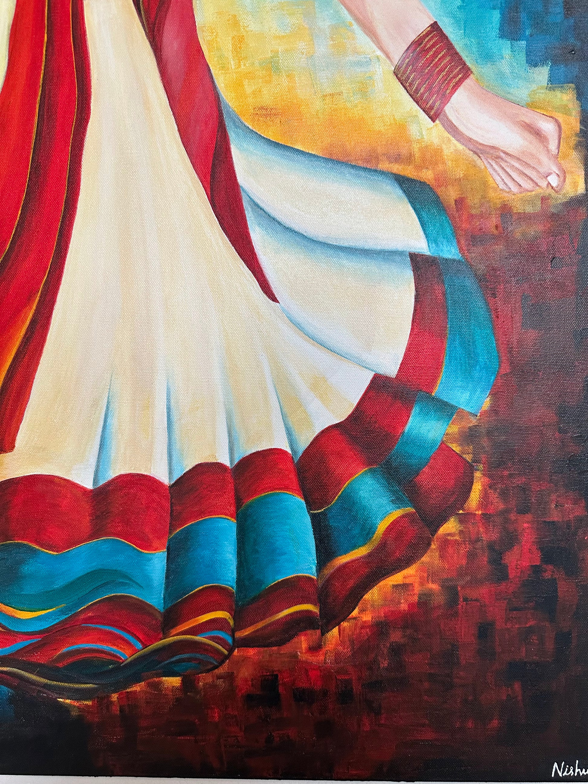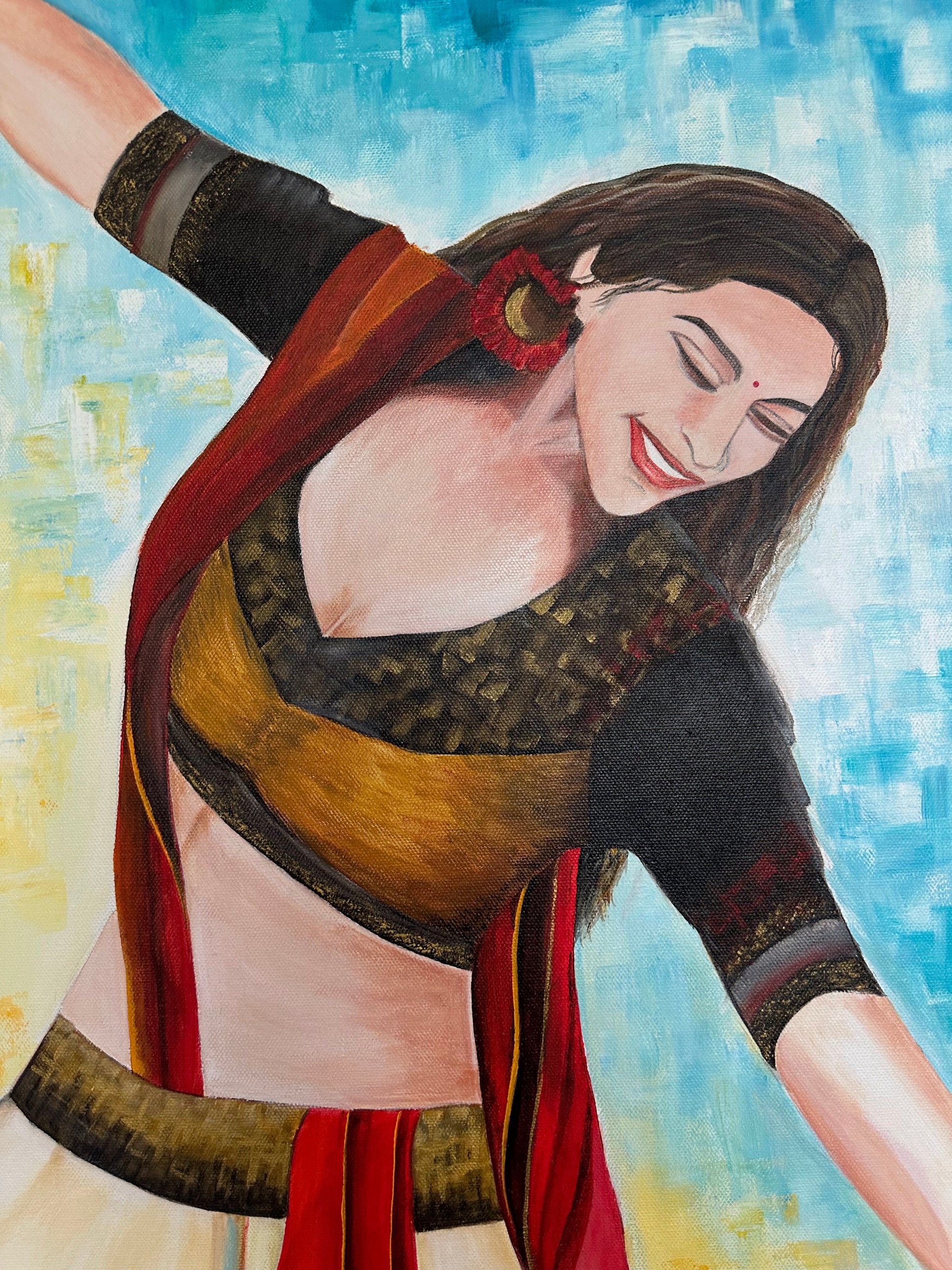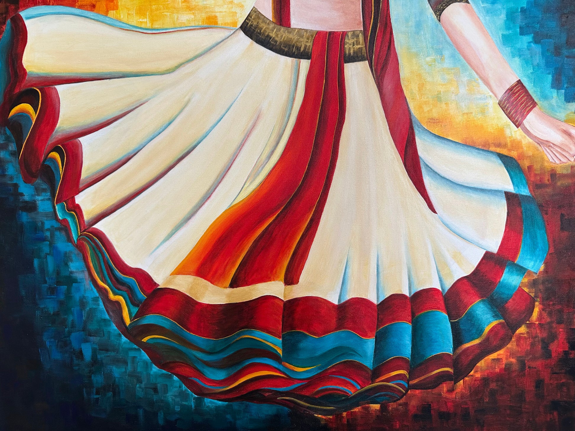 This painting captures the dynamic spirit of Garba dance through a vivid portrayal of a young girl in motion. Dressed in a traditional lehenga choli with striking red, black, and white hues, her swirling attire embodies energy and cultural richness. The pixelated mosaic backdrop of red, yellow, and blue enhances the composition by blending warmth and passion with a modern, balanced contrast. This artwork celebrates the harmony of tradition and contemporary expression with expert finesse.